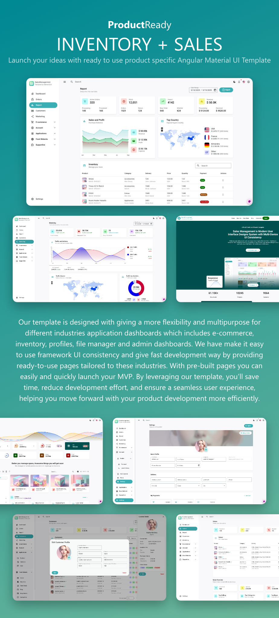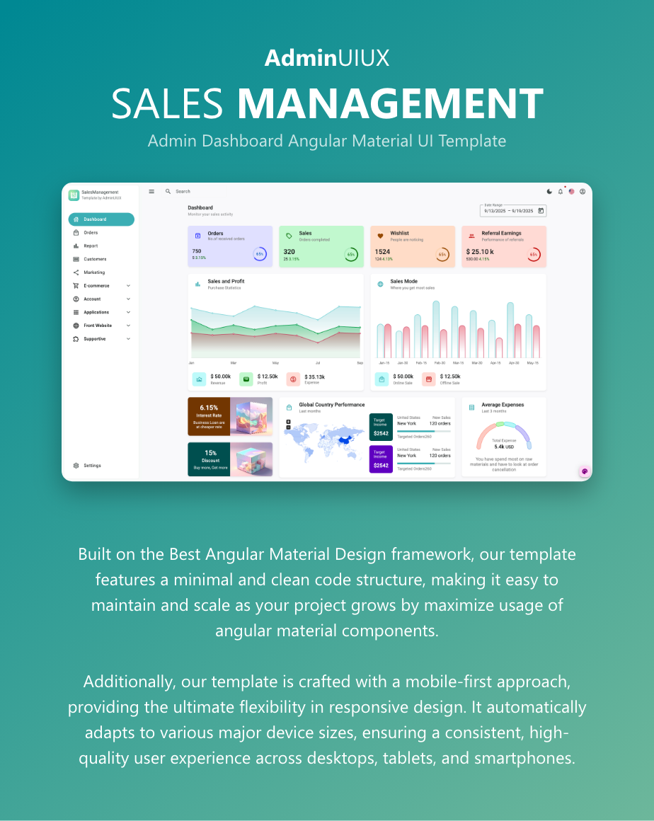 Preview DemoStart building your next enterprise-grade application with SalesManagement Pro, a premium, responsive Angular Material Admin Template engineered to streamline and accelerate your development workflow. This powerful Angular project UI kit is the perfect foundation for high-performance business applications, with a specific focus on Sales Management Dashboards, finance, complex inventory systems, and robust SaaS web apps.