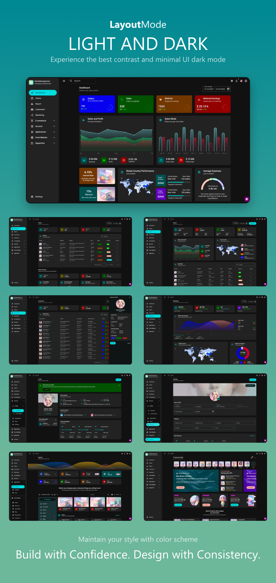 - Dedicated Sales Management Dashboard: Built-in layouts and components optimized for tracking sales pipelines, visualizing KPIs, and managing customer relationships.